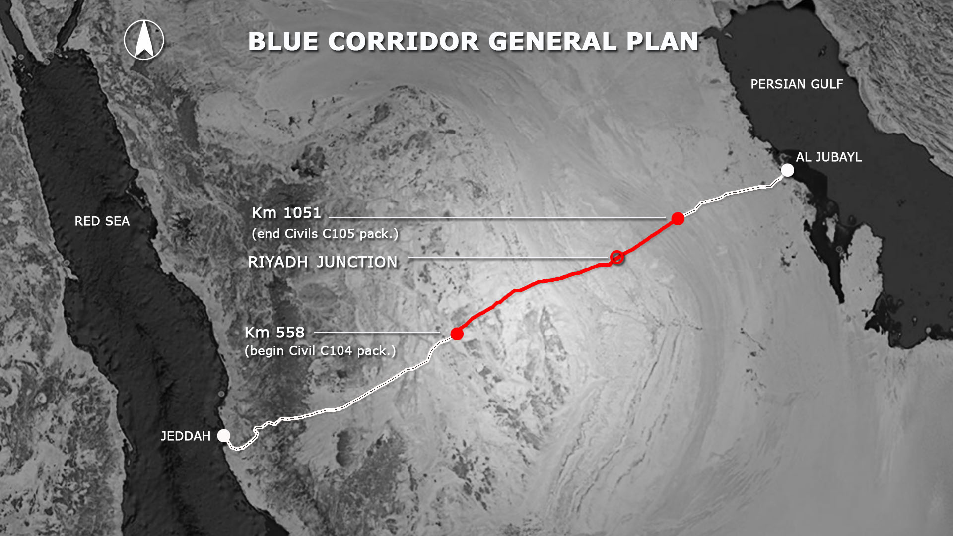 Overall the new corridor is characterized by Section 1 from km 0 to km 271 (part of the original Red Corridor) and then continues with Section 2 to Al Jubail from km 271 to km 1,300 (Blue Corridor), representing the central element of Saudi Arabia's railway improvement program for the purpose of social and economic development of the entire region.