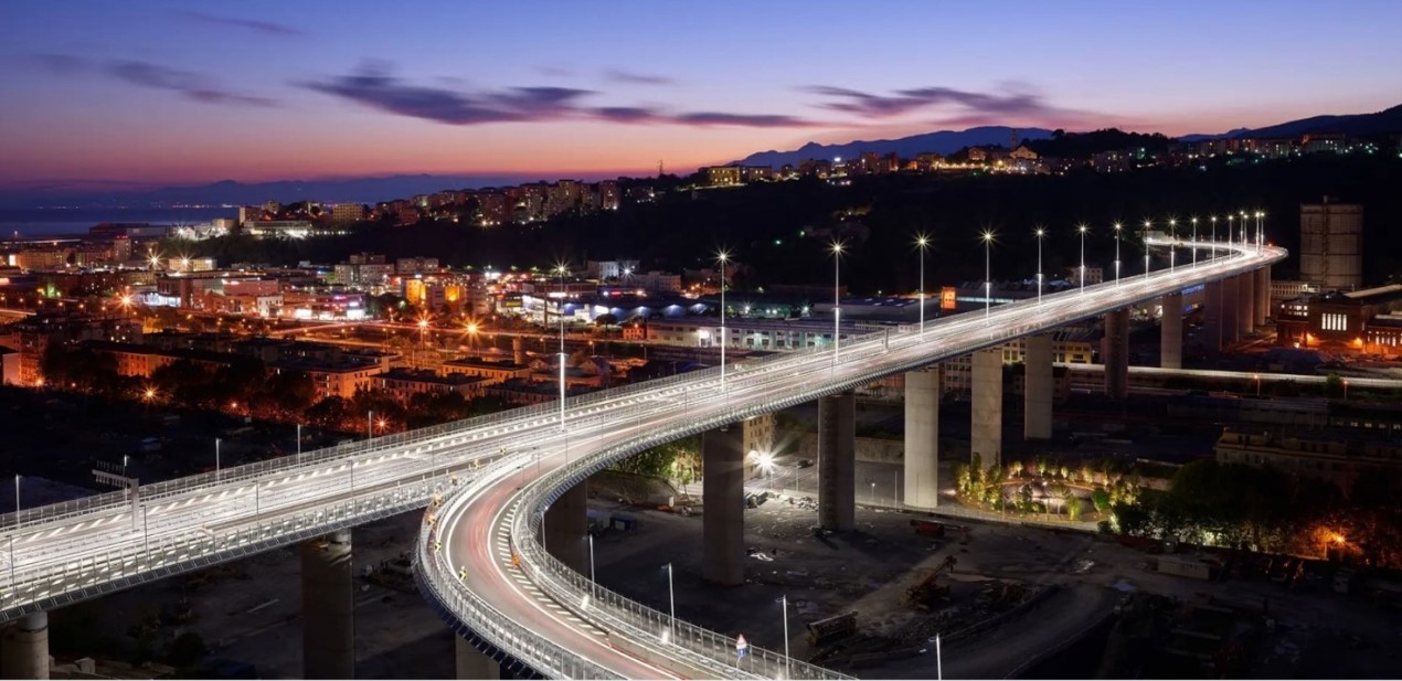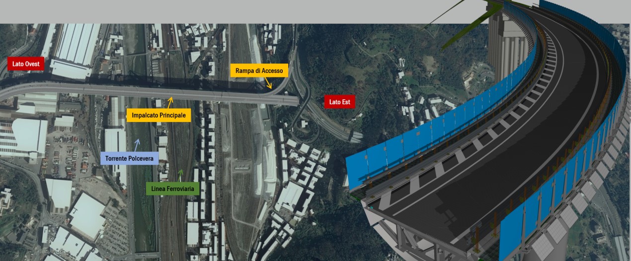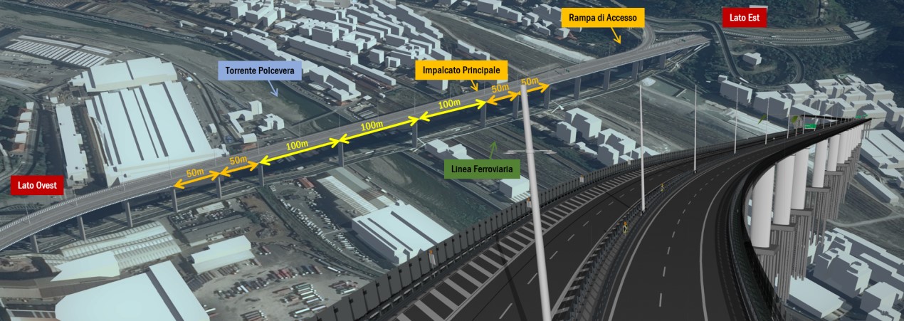 Il progetto Esecutivo, realizzato in tempi record, ha previsto la realizzazione della nuova infrastruttura sulla stessa giacitura del vecchio Ponte Morandi, con i necessari adeguamenti normativi alla sezione dell’impalcato e dei raggi di curvatura degli svincoli e delle immissioni.