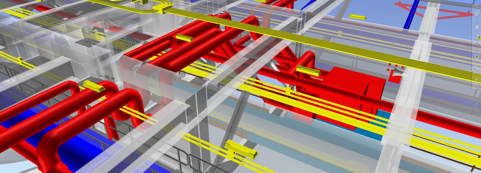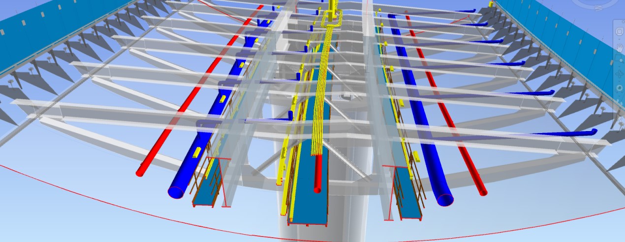 Il vantaggio di avere a disposizione un modello BIM, è stato quello di poter verificare la compatibilità tra i numerosi impianti delle diverse discipline tecnologiche e le opere civili, con particolare riferimento agli spazi ristretti, quali i passaggi in corrispondenza dei diaframmi di rinforzo dell’impalcato. Inoltre è stato possibile determinare in modo preciso la posizione delle apparecchiature, i relativi supporti e i pezzi speciali per l’ancoraggio alle strutture, con particolare riferimento ai profili non rettilinei. Si citano ad esempio i condotti sbarra elettrificati che alimentano gli utilizzatori elettrici all’interno dell’impalcato per i quali sono stati definiti gli esatti raggi di curvatura, i cambi di direzione e i giunti di dilatazione e i canali di diffusione dell’aria interna al cassone.