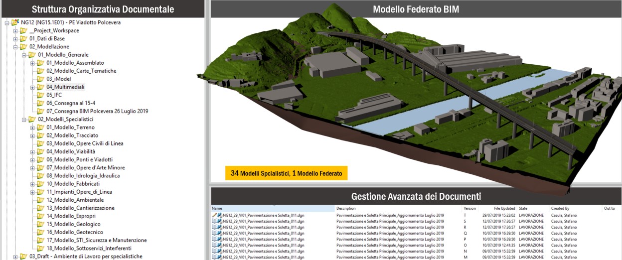 Prima di procedere con le attività di modellazione, è stato redatto un Piano di Gestione Informativa (pGI) per stabilire fin da subito le modalità operative e i contenuti del modello informativo BIM del Viadotto. Successivamente, per favorire lo scambio di dati e di informazioni tra le diverse parti interessate, è stato predisposto un ambiente condiviso sul quale è stata organizzata una struttura di cartelle in cui ogni disciplina ha disposto del proprio spazio di lavoro.